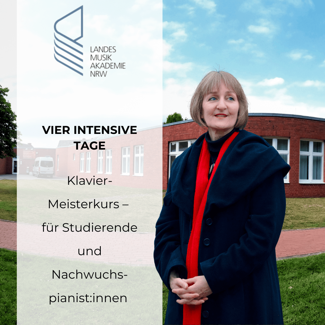 Vier intensive Tage mit der Pianistin, Kammermusikerin und Klavier-Professorin Konstanze Eickhorst bei der Landesmusikakademie NRW. Maximal zehn aktive Teilnehmende erhalten mindestens zwei Mal Unterricht anhand ihrer vorbereiteten Werke. Am Sonntag, den 04. Oktober 2026, beginnt der Meisterkurs mit einer Klavier-Soirée von Konstanze Eickhorst. Danach folgt das gemeinsame Kennenlernen im Gespräch. Alle Teilnehmenden sind in der Landesmusikakademie NRW untergebracht, die Mahlzeiten (Frühstück, Mittagessen, Kaffee und Kuchen, Abendbrot) sind im Preis enthalten.