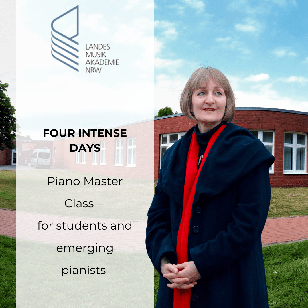 Four intensive days with pianist, chamber musician, and piano professor Konstanze Eickhorst at the Landesmusikakademie NRW. A maximum of ten active participants will receive at least two lessons based on their prepared pieces. On Sunday, October 4, 2026, the master class begins with a piano soirée by Konstanze Eickhorst. This will be followed by a get-together where participants can get to know one another. All participants will be accommodated at the Landesmusikakademie NRW; meals (breakfast, lunch, coffee and cake, dinner) are included in the price.